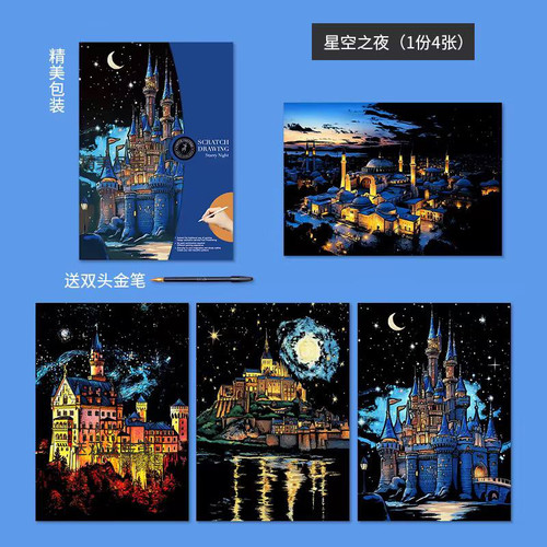 🌌🎨 اسکرچ بزرگسال نقاشی خراشیدنی «شب پُرستاره» سایزA3 مجموعه ۴ برگی 🎨🌌